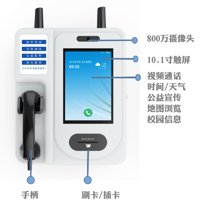 新一代智能校园公共通话解决方案是对传统公共话机的革新,老式校园公共插卡话机,只能达到基本的通话功能,智能校园公共通话解决方案在基本通话功能的基础上,实现 4G Volte视频通话、WIFI、信息浏览、校方与学生互动等功能。从外观、功能、互动体验大大提升,同时也有助力校园精细化管理,提升和谐平安校园建设。